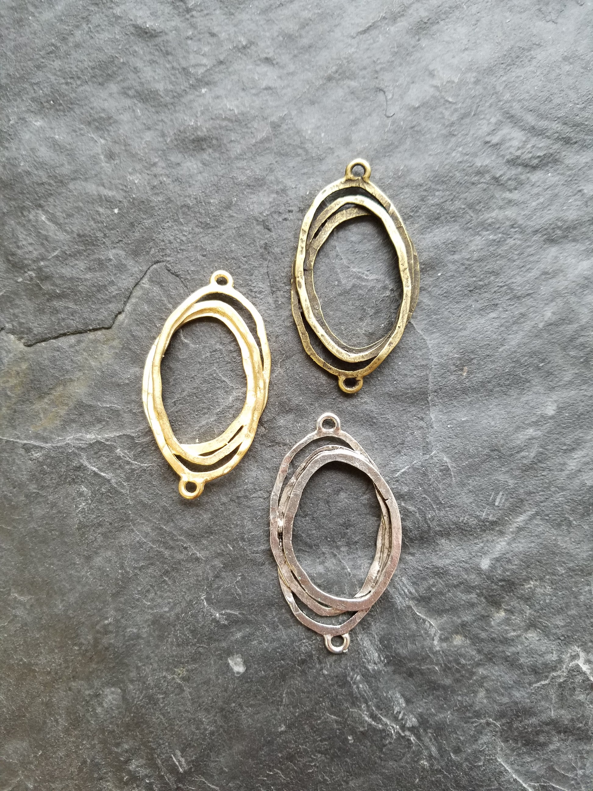 These beautiful pewter artisan 36X23mm organic oval connectors have 2 rings to connect. They are available in all four metal colors.